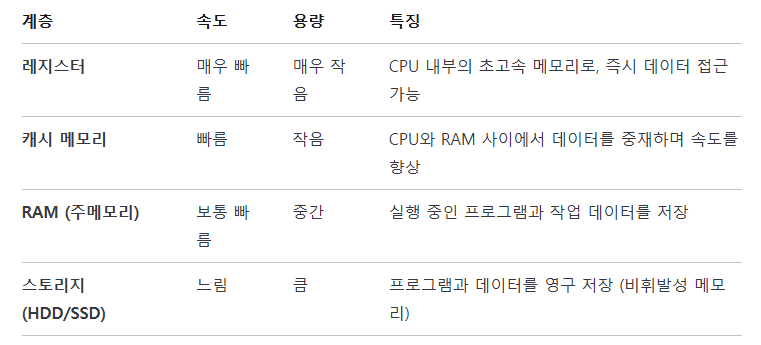 - 용도: 일반적인 PC 메모리로 사용됩니다.※ 메모리 계층 구조의 단계
