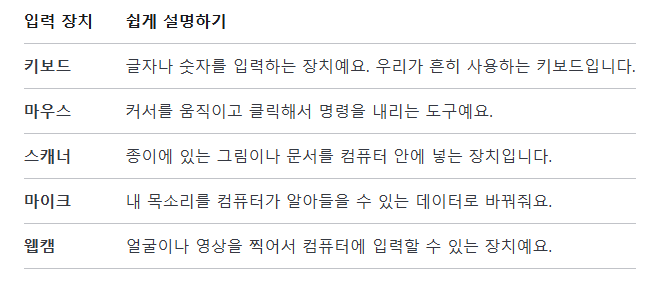 - 입력 장치는 우리가 컴퓨터에 데이터를 넣는 역할을 하고