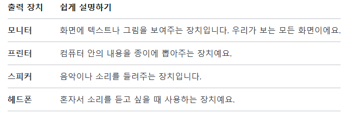 - 출력 장치는 컴퓨터가 처리한 결과를 우리가 볼 수 있게 해줘요. I/O는 Input(입력)과 Output(출력)의 줄임말이에요.